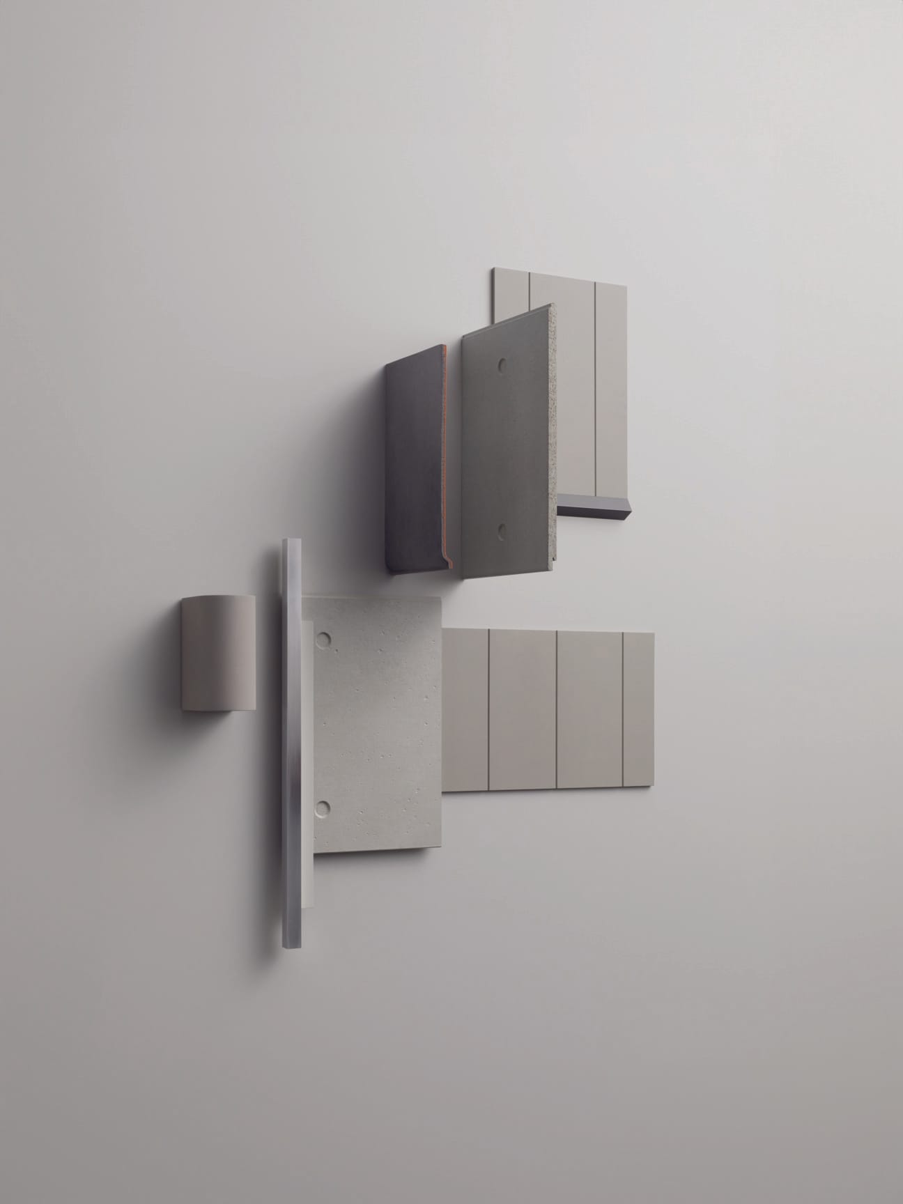 A soft, warm grey palette with minimal variation and a calming appeal is distinguished by minimally textured concrete-toned cladding with a deep charcoal roof and crisp metal trims.