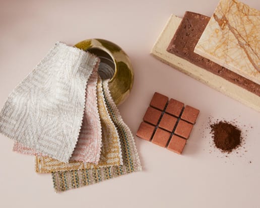 Look 2: Pair unexpected colours using Warwick Fabrics' Grand Onyx, Leonardo Golden, Tilba Ocean, Airlie Terracotta, Akito Ocean, Pushka Manuka, Leonardo Blush, Akito Terracotta. Noire d'ivoire tile, from Artedomus, Morada Nero Gloss bricks from PGH Bricks. Oh My Mini Sculpture Pink, from Makers Mrkt. Background is Laminex: Surround Scallop 22.5. Paint colours: Kenepuru, Harmonious, and Pax, all Dulux.