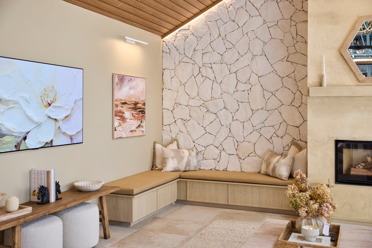 In week 5, House 3's Britt and Taz used PGH stone to create a cosy and homey feel for their accent wall in the living and dining room. For this build, they used PGH Natural Fieldstone in the colour ‘Whitehaven’, emphasising the neutral tone of the room of creams, browns and white, bringing the room together.